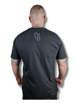 T-shirt w kolorze ciemno szarym. Z przodu wzór CS LAUR...