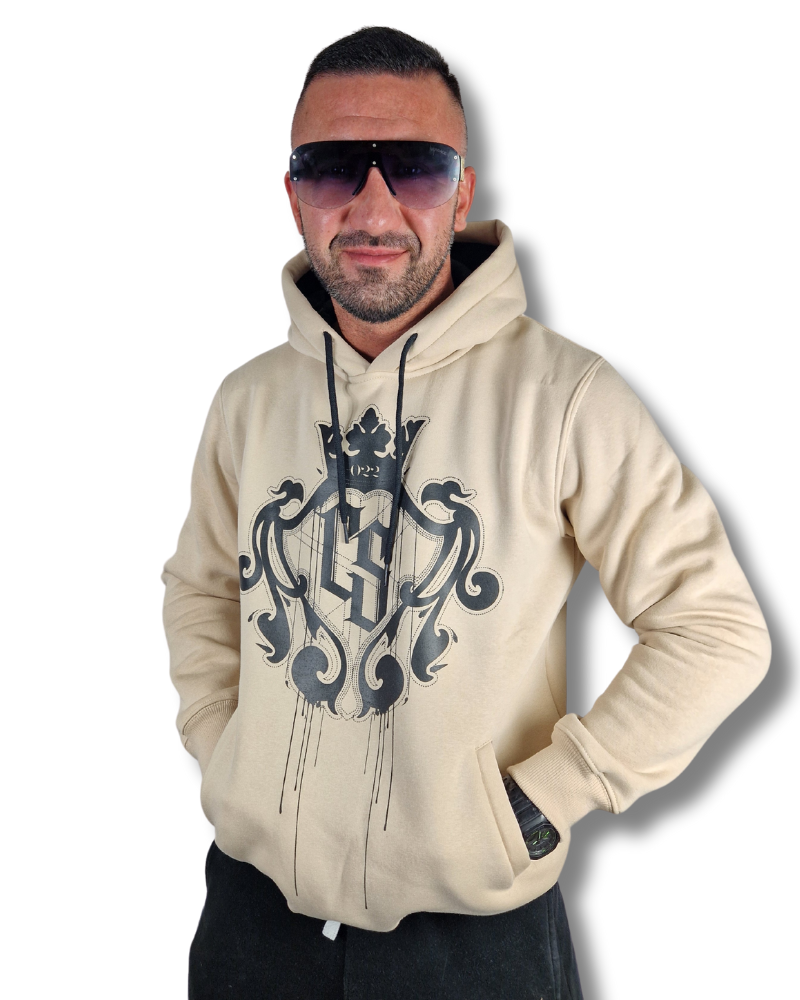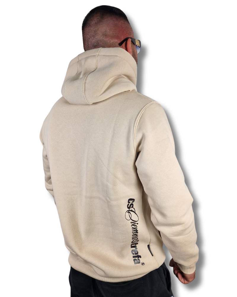 Bluza kangurka w kolorze jasnego beżu z dużym logo CS HERB wykonany metodą sitodruku.