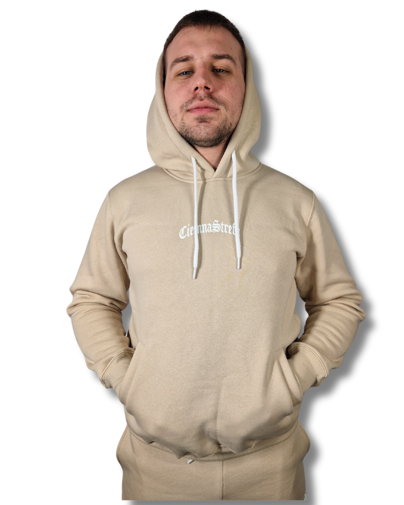 Bluza kangurka w kolorze jasnego beżu z dużym logo CS GOTYK na plecach wykonany metodą sitodruku.
